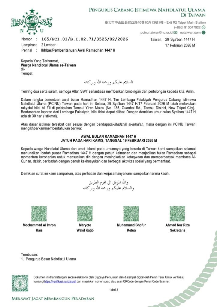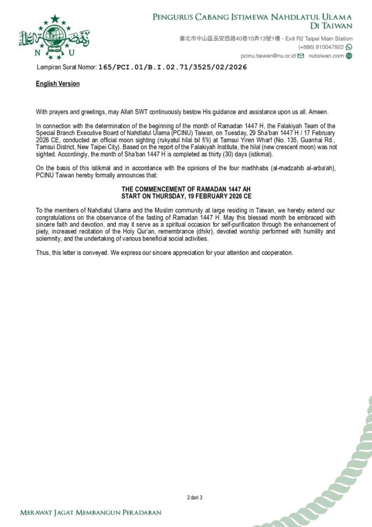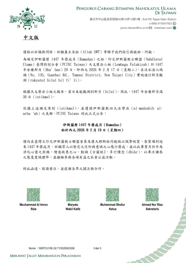 Berdasarkan hasil rukyatul hilal yang dilaksanakan oleh Tim Lembaga Falakiyah PCINU Taiwan pada Selasa, 29 Sya’ban 1447 H / 17 Februari 2026 M di Taipei, dan dengan metode istikmal (penyempurnaan 30 hari bulan Sya’ban), maka: